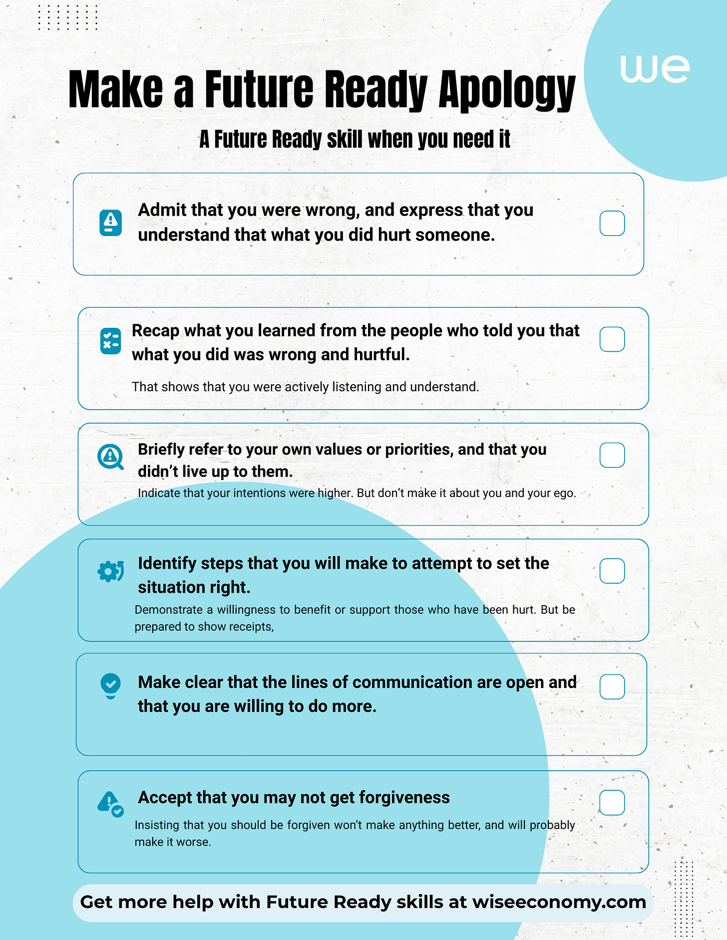 I’ve written about apologies in the past, and I condensed that advice into this handy checklist. Stick this somewhere you can see it, and hopefully the next time you have to apologize — whether it’s to the press or your spouse — you’ll cover everything you need to enable a reconciliation to start.